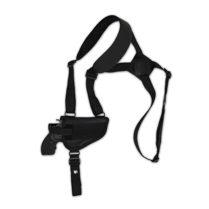 The Black Nylon Horizontal Shoulder Holster – Single Pistol from Hunting Holsters is your go-to lightweight concealment rig. The horizontal (muzzle-rear) orientation enables a fast, natural cross-draw while the adjustable webbing harness spreads weight comfortably across the shoulders. A thumb-break retention strap secures the handgun, and the tie-down keeps the holster anchored during movement.