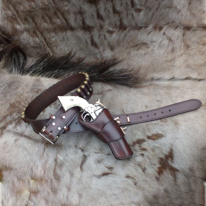 This configuration mirrors historically accurate Western carry methods rather than contemporary tactical systems.